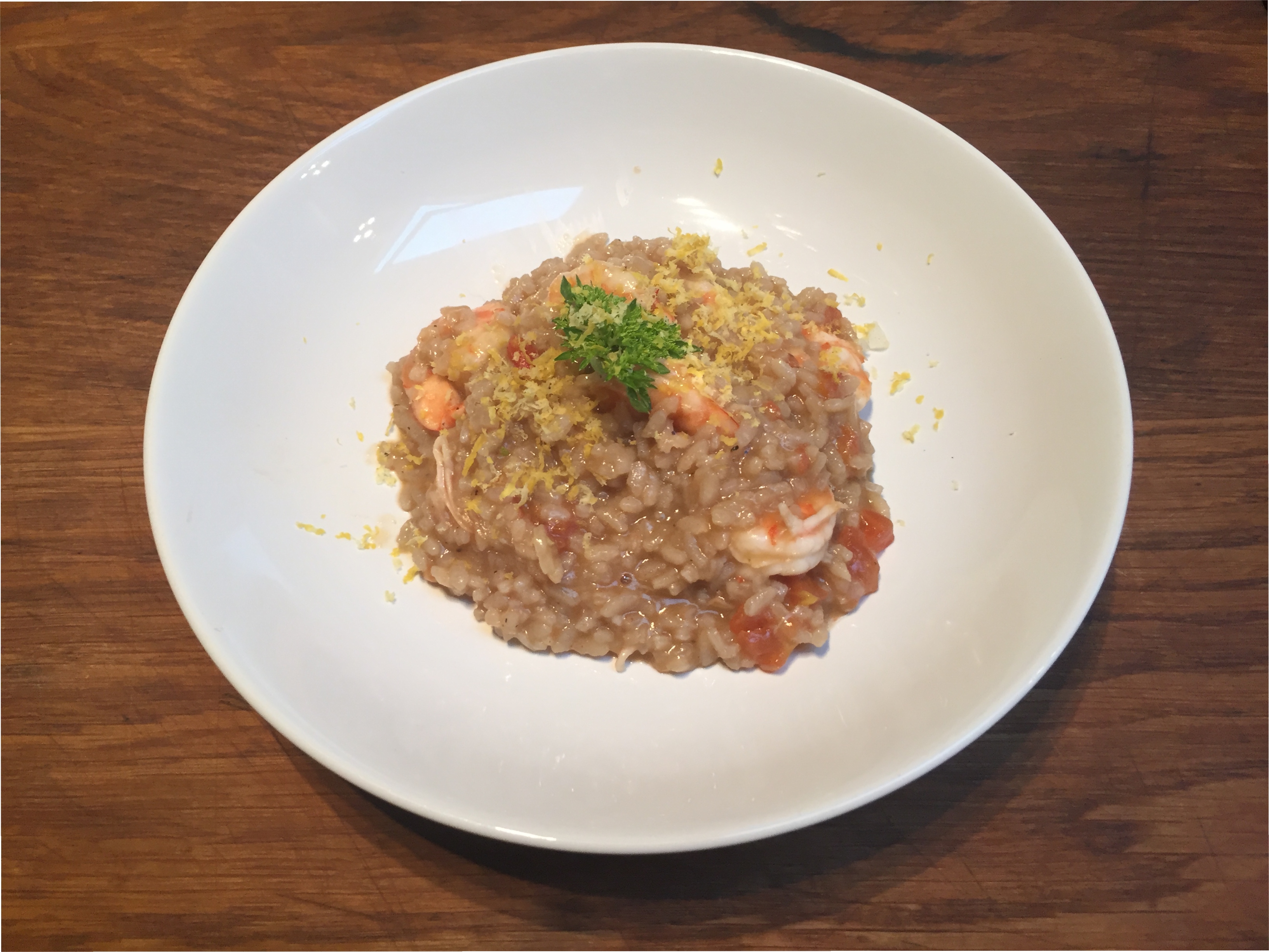 | Prawn Risotto Pour René Enjoy! Ingredients (for four) Prep time 20 minutes Cook time 20-25 minutes 1 cup arborio or carnaroli rice To prepare the prawns, remove their heads and shells, saving them in a saucepan. Slit the prawns down the centre of their backs and remove the black stringy strand of digestive system material and discard. Store prawns in ice water or in fridge while stock is prepared. In the saucepan with the shells and heads add the chopped onion, and a small amount of either olive oil or butter. Sweat down the onion and 1 chopped of clove garlic over low heat until they're translucent -- no colour and then add 1 litre of water and the shells and heads from the prawns. Add the fish sauce and bring to a boil. At this stage reduce the mix to a simmer and let it bubble away for half an hour. If using commercial stock mix to augment this mix add it as the pan comes to a boil and stir to make sure it dissolves. If you are not using a stock mix then some salt will be necessary. Strain the broth through a fine sieve and discard all but the liquid. In another saucepan add a few millimeters of